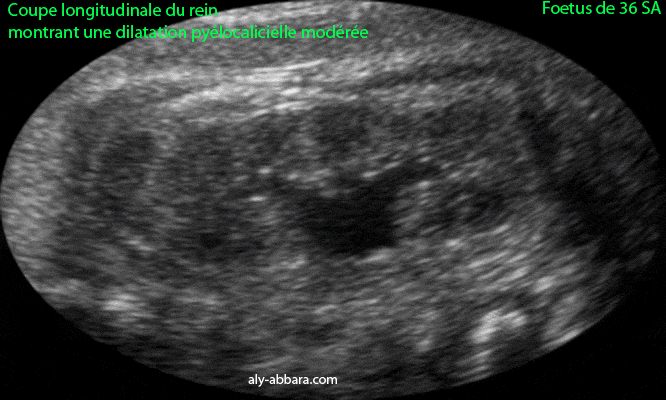 Dilatation pyéllocalicielle modérée d'un rein Fœtus âgé de 36 SA |