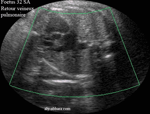 Image échographique (avec Dynamic Flow) montrant le retour veineux pulmonaire qui se fait par l'intermédiaire des quatre veines pulmonaires (deux venant de la circulation veineuse pulmonaire droite et celle du poumon gauche) ; ces quatre veines acheminent le sang veineux à l'oreillette gauche du cœur Fœtus de 32 semaines d'aménorrhée |