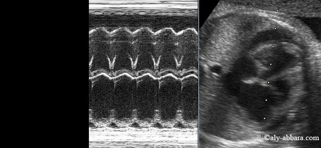 La qualification de supraventriculaire a été donnée à cette tachycardie fœtale car le mode TM montre que les ventricules et les oreillettes battent à la même fréquence (237 battements par minute dans cet exemple). L'épanchement péricardique fait partie des manifestations habituelles de l'insuffisance cardiaque. Dans le cas présent, l'insuffisance cardiaque est la conséquence de cette tachycardie fœtale supraventriculaire sévère : cœur fœtal battant en permanence à une fréquence de (220 à 240) battements par minute. La présence de la tachycardie fœtale est à l'origine de la diminution des variations des volumes systoliques et diastoliques des quatre cavités cardiaques, d'où les signes de l'insuffisance cardiaque fœtale (épanchement péricardique, ascite, hépato-splénomégalie, œdème des téguments cutanés, polyhydramnios et épaississement œdémateux du placenta. |