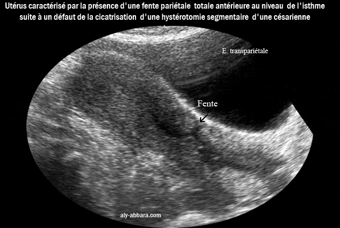 Il s"agite d'une fente traversant la totalité de la paroi antérieure de l'utérus, au niveau de son isthme, suite à un défaut de la cicatrisation de l'incision (hystérotomie) segmentaire transversale d'une césarienne datant de 7 ans auparavant.