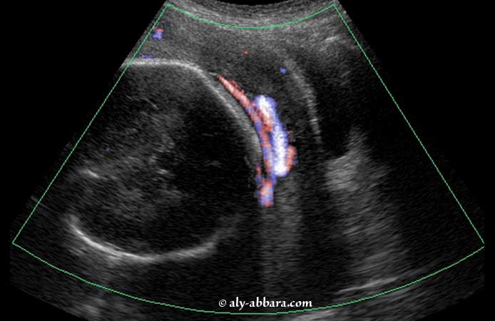 - A 38 SA, le placenta, échographiquement n'est plus bas inséré, mais le diagnostic de vasa prævia fut toujours d'actualité, donc une césarienne programmée fut réalisée à ce terme ; l'examen macroscopique des annexes fœtales confirme le diagnostic échographique en mettant en évidence l'insertion marginale du cordon (en raquette), avec un réseau vasculaire composé d'artères et de veines reliant le cotylédon aberrant au cordon ; l'extraction chirurgicale fœtale aboutit obligatoirement à l'ouverture de la poche des eaux avec la rupture de quelques-uns des ces vaisseaux prævia.