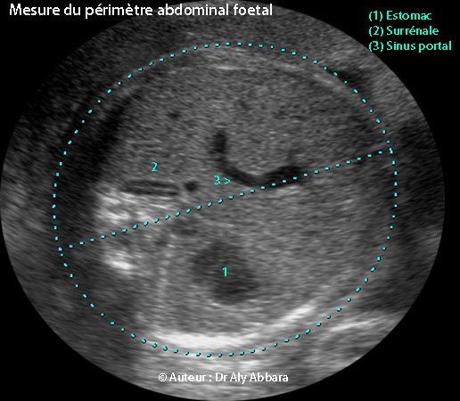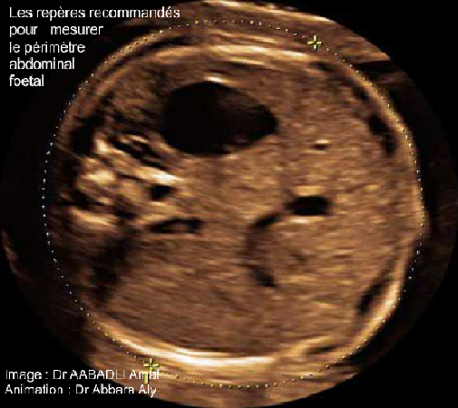 - Le périmètre (ou la circonférence) abdominal fœtal dessine une ellipse passant par l'interface entre la surface de la peau de l'abdomen et le liquide amniotique.