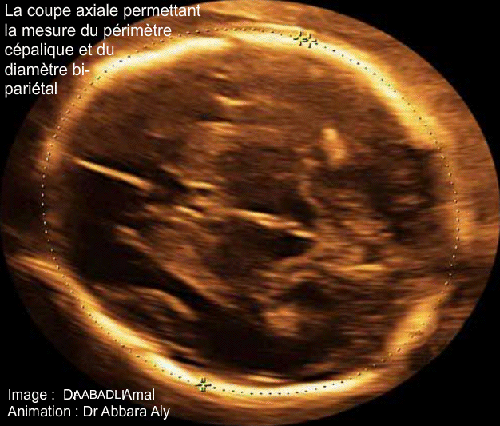 - Il s'agit d'une coupe transversale (axiale) de la tête fœtale ; sur cette coupe il faut réunir les paramètres suivants :