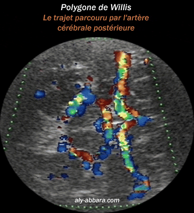 Coupe axiale du cerveau ftal à 35 SA montrant le polygone de Willis et le trajet de