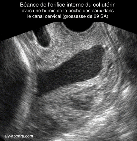Coupe sagittale passant par le col utérin à 29 semaines d'aménorrhée Il s'agit d'un col long de 51 mm avec orifice interne béant et une hernie de la poche des eaux dans le canal endocervical. A noter que le toucher vaginal (TV) ne permettait pas de diagnostiquer cette incompétence cervico-isthmique, car lors de cet examen le col paraissait long de 3 cm et fermé