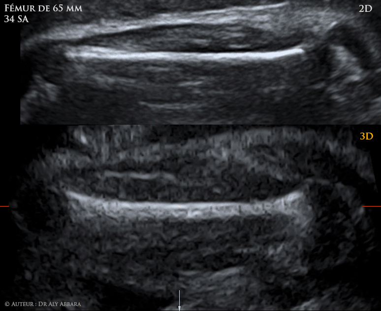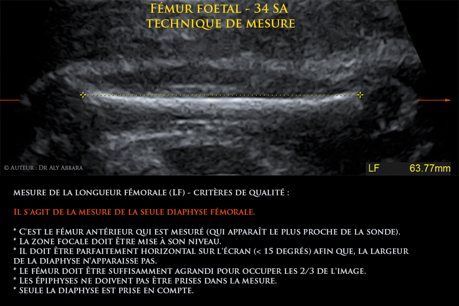 - Il doit être parfaitement horizontal sur l'écran (< 15 degrés) afin que, surtout au 3e trimestre, la largeur de la diaphyse n'apparaisse pas (observez la première image dans cet article).