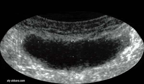 Aspect échographique d'une collection sérosanglante (une sérocèle) au niveau du plan sous cutané d'une cicatrice de césarienne (par incision transversale de Pfannenstiel) 16 jours auparavant.