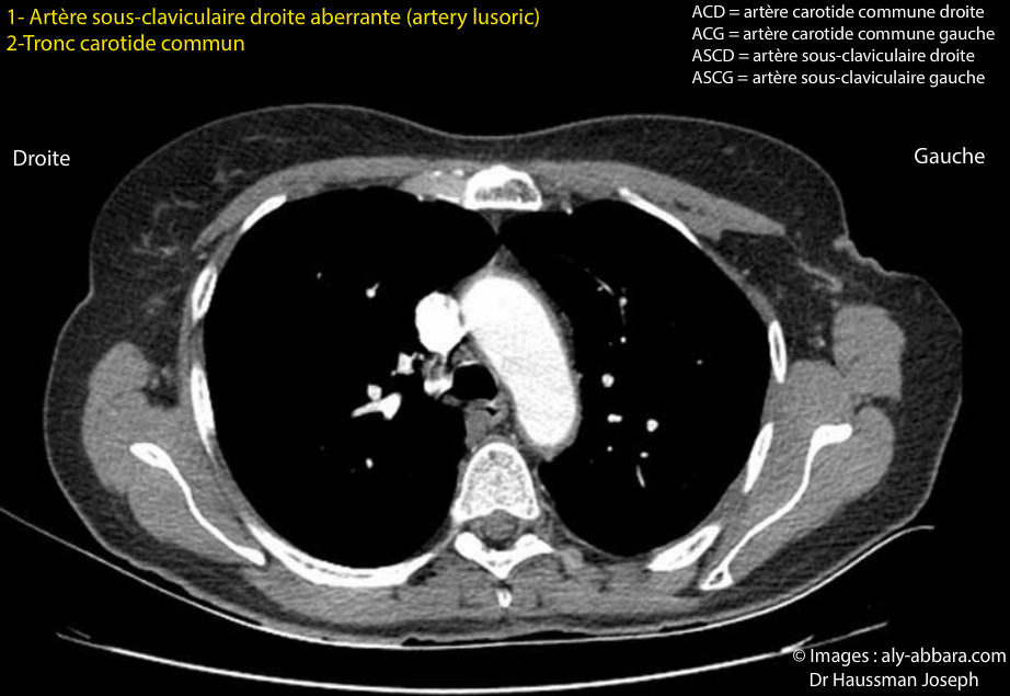 - 3- l'artère sous-claviculaire aberrante droite (ou l'artère lusoric -arteria lusoria) qui se dirige vers le haut, l'arrière et à droite puis passe derrière l'œsophage et enfin, se dirige vers la droite et en avant pour atteindre la région sous-claviculaire droite et le membre supérieure homolatérale.