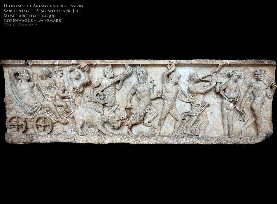 Dionysos et Ariane en procession : Dionysos sur son char, enlaçant son épouse Ariane (Ariande) ; un enfant assis près du dieu ; une Ménade dansant et jouant du cymbale, elle suivie par un satyre précédé par un autre tenant un flambeau. Deux panthères tirant le char, Éros chevauchant un des panthère. Au milieu de la scène on identifie le dieu pastoral Pan, précédé par un satyre tenant un thyrse, puis une Ménade jouant de la flûte double, puis une autre Ménade dénudée et jouant de la lyre, puis à la tête du cortège on trouve le dernier satyre en attitude d'avancement.