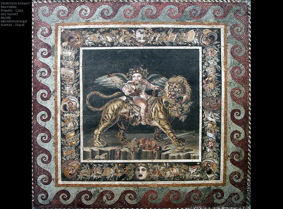 Naples - Musées archéologique Pompéi, Casa del fauno - mosaïque " Dionysos enfant chevauchant une panthère, son animal symbolique "
