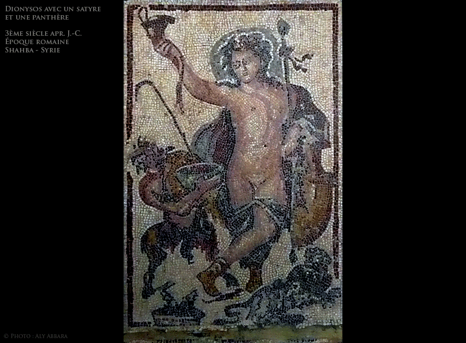 Dionysos - Dionysus (Bacchus) : Ses titres : Son nom "Di-wo-nu-so-jo" apparaît sur des tablettes mycéniennes découvertes à Pylos, dès le XIIIe siècle av. J.-C. Homère, au VIII siècle av. J.-C le décrivit comme la "Joie des mortels". Il est le dieu de la culture de vigne (la viticulture), de vin et le dieu de l'ivresse ; il fut vénéré également comme le dieu protecteur des jardins, dieu de l'agriculture (comme Déméter) ; dieu de la végétation et des bois, dieu des fruits, dieu de l'arbre, génie des jeunes pousses ; dieu du renouveau saisonnier ; dieu de l'eau (dieu humide), dieu de la fécondité humaine et animale ; le dieu incarnant les forces de la nature qui permettent aux fruits et plantes d'atteindre leur maturité grâce à la chaleur et l'humidité ; il est la source de toute vie. Il est dénommé "Phallen ou Phallènos" du mot "phallus" ou "pénis en érection" qui pouvait être présent et dévoilé lors de ses orgies (les processions du Phallus). Il fut adoré comme étant le dieu de la vie joyeuse, des fêtes et des jeux à l'image de ses cortèges bachiques festifs. Les Romains le vénéraient comme étant le protecteur des Beaux-arts et le dieu du théâtre, en particulier, la tragédie, la comédie et le drame satyrique (pièce de théâtre dont les acteurs sont en partie des Satyres). On lui donna un rôle important dans le développement de l'orphisme. Dionysos est également le dieu de la folie et la démence extatique (provoquée par l'extase) et encore le dieu de l'inspiration et la transgression des règles morales sociétales et de l’ordre rationnel. Parmi ses autres qualificatifs : Polyonymos (aux multiples appellations) ; Bromios (le Frémissant ; le Grondant ; le Bruyant ; le Bruissant ; le Délirant et le Tapageur) ; Lyaios (Délivreur des soucis) ; Nyktélios (dieu des mystères nocturnes ; dieu de la nuit) ; Lénaios (ou Lénéus - dieu des pressoirs). Il fut qualifié par Homère de " mainoménoio ", c'est-à-dire, le délirant. Il fut également appelé le dieu civilisateur ; le dieu sauvage ; le dieu des mystères... Bacchos, Iobacchos, Ériboas, Évios (ces deux derniers noms évoquent le bruit caractéristique de ces célébrations ; Iacchos (personnification d'un cri rituel lancé pendant la procession à son honneur d'Athènes à Éleusis). Iacchos est également le fils de Zeus et Déméter ou Perséphone, il est également le troisième Dionysos fils de Bacchos et d'Aura. Dionysos fut décrit, comme les Ménades qui l'accompagnent, de dieu qui dévore la viande de ses victimes crue (omophage ou ômophage), sanglante et encore palpitante ; ces victimes furent souvent des animaux sauvages poursuivis et déchiquetés vifs. Dionysos fut décrit dans des textes anciens comme le " dieu étranger " ou simplement " l'Étranger ", cela peut s'expliquer par sa double naissance et la grande partie de sa vie qui s'est déroulée dans des contrées lointaines de l'Olympe. Dionysos descendit aux Enfers pour extraire sa mère Sémélé de ce monde infernal afin de l'emmener à l'Olympe, le lieu où vivent les privilégiés immortels. Pour cette raison, Dionysos est considéré comme un " libérateur des Enfers ", un dieu " un dieu chthonien = relatif à la terre, aux catacombes et au monde souterrain", " conducteur des âmes " ; un dieu infernal qui dirige la danse des morts et les initiés à ses mystères dans les prairies des Enfers. Ses fonctions chthoniennes le rapprochent du dieu Hermès. Dionysos est le dieu qui préside les déchaînements provoqués par l'ivresse des buveurs, par la musique et la danse ; il anime également l'explosion de violence qui saisit les foules et qui peut se manifester chez les personnes frappées de folie. Ces caractéristiques dégradées de la nature humaine s'expriment parfaitement lors des orgies (orgiaques, orgasme) et des fêtes dionysiaques (bacchanales) qui sont des manifestations régressives, le retour au chaos (l'anarchie originelle), l'ivresse associée à la débauche, l'excentricité, l’irrationalité, la perte du contrôle de soi et la violence qui peut mener aux sacrifices animaliers et aux homicides (consulter : la mort d'Orphée et le mythe de Penthée). Dionysos était adoré sous forme de chevreau portant le nom de "Ériphos" ou "Ériphios". Dans l'Empire romain, Dionysos devient " Bacchos " puis " Bacchus " et également " Liber ". Iacchos chez les Romains est identifié à Liber. Dans la triade romaine Cérès-Liber-Libra, qui représente les forces de la fécondité. Cérès et interprétée comme étant la déesse grecque Déméter ; Libera est Perséphone-Coré et enfin, Liber (Libre) est Dionysos parce qu'on croyait que ce dieu délivre l'esprit des hommes de tous les soucis grâce au vin. Les peuples orientaux appelaient Dionysos " Dieu de Nysa " ; Nysa était la montagne dans laquelle le dieu a passé un certain temps durant son enfance. Il existait Dionysos-renard, ou Bassareus, c'est-à-dire couvert par une fourrure de renard (bassara), puis les Bassarides qui n'étaient que les Ménades de Lydie et de Thrace qui ont mis en pièces Orphée, lui-même coiffé d'une peau de renard et portant des chaussures en peau de renard. Ses représentations : On le représente comme un dieu barbu, à longue chevelure, souvent couronné de : lierre (d'où l’appellation " Apollon au lierre ") ou de feuilles de vigne, de pampre (branche de vigne portant des feuilles), de grappes de raisin, de feuilles de figuier et parfois de fleurs de lotus. Dionysos peut être représenté sous forme de tête barbue de style Dionysos-Sardanapalos : Sardanapale, Sardanapalos ou Sardanapalus, est le fils d'Anakindaraxés, empereur d'Assyrie. Sa vie constitue dans l'antiquité grecque, l'exemple d'une existence caractérisée par la richesse exagérée et la luxure immodérée ; par la mollesse et la débauche morales où rien n'est ni interdit ni sacré. Parfois il est représenté cornu comme un taureau (les co