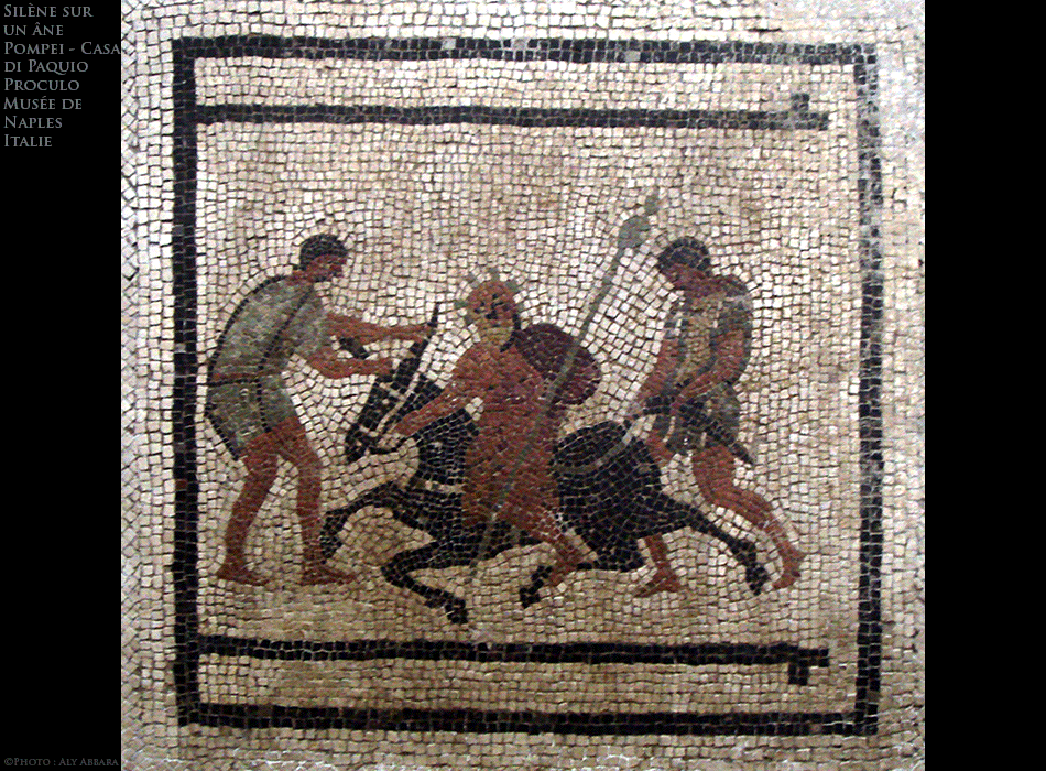 Naples - Italie - Musée archéologique Mosaïque - Pompéi - Casa di Paquio Proculo " Silène saisissant un thyrse (emblème de Dionysos) et chevauchant un âne que deux personnes tentent de maîtriser en le prenant par les oreilles et la queue "