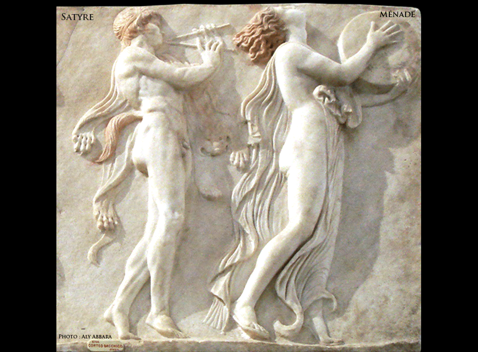 Naples - Musées archéologique Bas-relief provenant d’Herculanum Thiase de Dionysos Une Ménade dansant et jouant de tambourin ; poursuivie par un satyre vêtu également d'une nébride et jouant de la flûte double