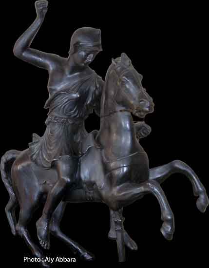 Dans les œuvres d'art de l'Antiquité, on représente les Amazones souvent à cheval, elles sont dans ce cas armées d'une lance