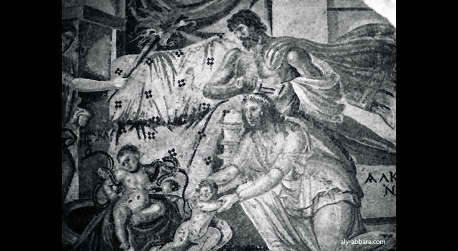 | Insatisfaite, Héra voulut détruire les jumeaux en envoyant deux serpents dans leur berceau. Déjà gaillard et prouvant sa nature divine, le bambin Héraclès étouffa les reptiles, un dans chaque main, tandis qu’Alcmène éloignait en toute hâte Iphiclès terrorisé. |