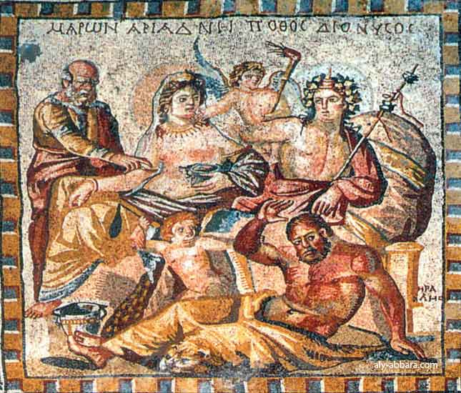 Mosaïque de l'époque romaine montrant Héraclès, Dionysos et Ariane... Héraclès est facilement reconnaisable grâce à la peau du lion de Némée qui recouvre la moitié