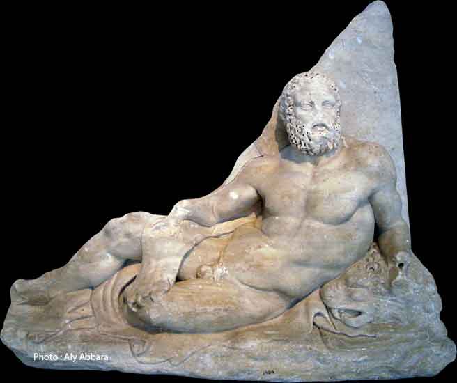 allongé sur une roche sur laquelle il a étendu la peau du lion de Némée.