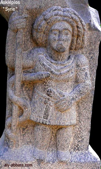 s'appyant sur un bâton sur lequel s'enroule un serpent, surnommé