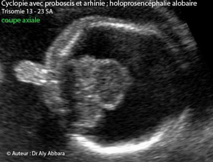 puis dans 72 % des cas, les anomalies sévères de la face ( , ) sont habituellement présentes dans l'holoprosencéphalie alobaire (cyclopie, proboscis, hypotélorisme, si deux yeux sont présents comme c'est le cas dans éthmocéphalie, la cébocéphalie, et les fentes labiopalatines médianes).