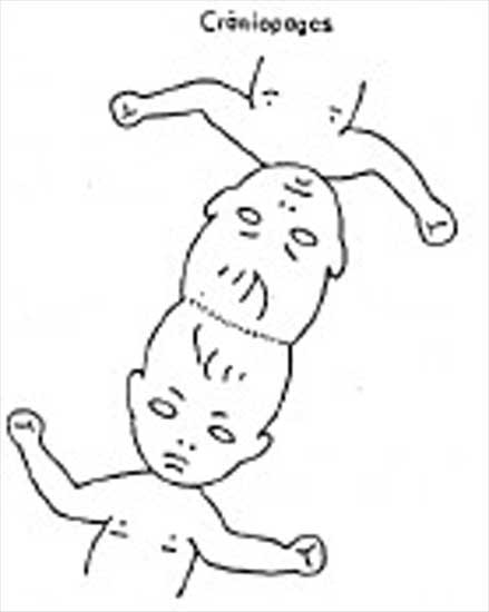 Monstres doubles crâniopage de la famille des tératopages, eusomphaliens Image extraite de : A. Morin, Professeur au laboratoire d'Anatomie - Université Cl. Bernard - Lyon.