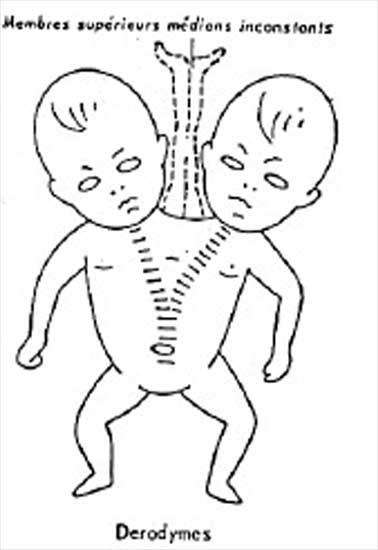 Monstre double dérodyme Image extraite de : A. Morin, Professeur au laboratoire d'Anatomie - Université Cl. Bernard - Lyon. " Histoire des monstres doubles ". Paleobios, 1987, Vol 3, N°1, pp 21-48 / Lyon - France SSN 0294-121 X.
