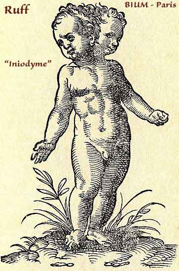 (une variété des monstres doubles tératodyme, monosomien, en Y) Gravure Du Médecin Allemand Rüff (XVI siècle)