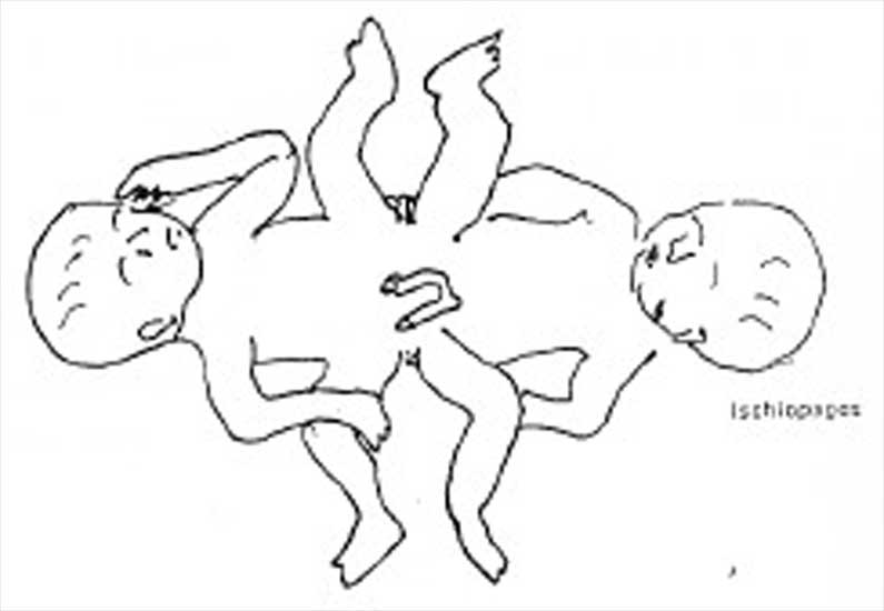 Monstres doubles ischiopage de la famille des tératopages, monomphaliens Image extraite de : A. Morin, Professeur au laboratoire d'Anatomie - Université Cl. Bernard - Lyon.