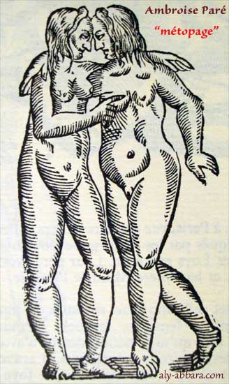 Plusieurs cas célèbres de "métopagie" sont signalés aux seizième et dix-septième siècles, dont un cas décrit à Mayence en 1501 par Boaistuau, Ambroise Paré, Sebastian Münster, de naissance de deux jumelles aux corps entiers et bien formés, mais jointes par le front, qui vécurent jusqu'à dix ans, puis Paré précise que l'une des jumelles étant morte, fut séparée de l'autre, qui lui survécut peu de temps à cause de l'infection de la plaie chirurgicale de la séparation.
