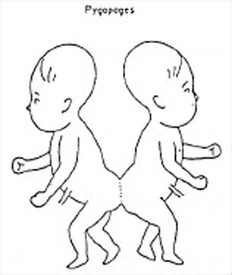 Monstres doubles pygopage de la famille des tératopages, eusomphaliens Image extraite de : A. Morin, Professeur au laboratoire d'Anatomie - Université Cl. Bernard - Lyon.