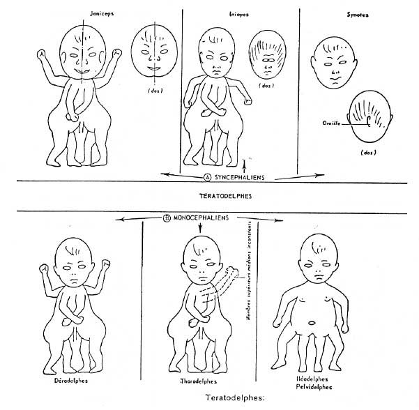 Monstres doubles tératodelphes Image extraite de : A. Morin, Professeur au laboratoire d'Anatomie - Université Cl. Bernard - Lyon. " Histoire des monstres doubles ". Paleobios, 1987, Vol 3, N°1, pp 21-48 / Lyon - France SSN 0294-121 X.