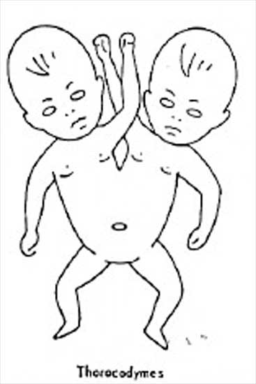 Monstre double thoracodyme Image extraite de : A. Morin, Professeur au laboratoire d'Anatomie - Université Cl. Bernard - Lyon. " Histoire des monstres doubles ". Paleobios, 1987, Vol 3, N°1, pp 21-48 / Lyon - France SSN 0294-121 X.