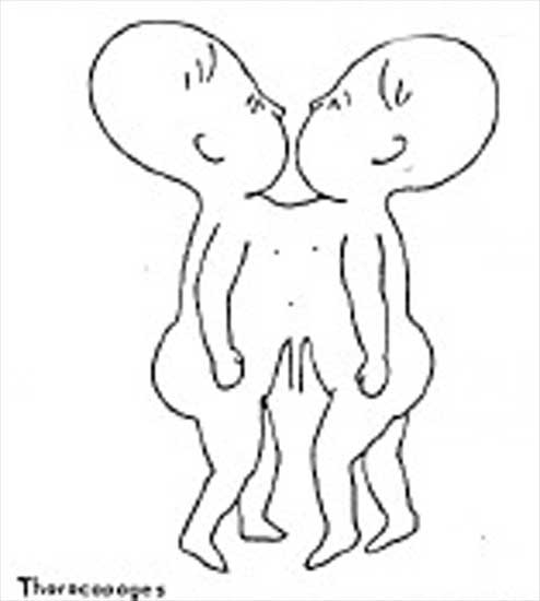 Monstres doubles thoracopage de la famille des tératopages, monomphaliens Image extraite de : A. Morin, Professeur au laboratoire d'Anatomie - Université Cl. Bernard - Lyon.