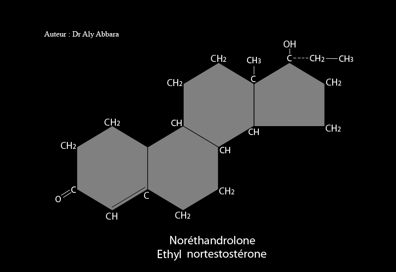 | Ethyl de nortestostérone = Noréthandrolone Progestatif de synthèse dérivé de 19-nortestostérone Il résulte de la suppression du carbone (19) de la structure chimique de la testostérone, et de l'insertion d'une fonction d'éthyl en position alpha à l'atome du carbone (17) Structure chimique simplifiée |