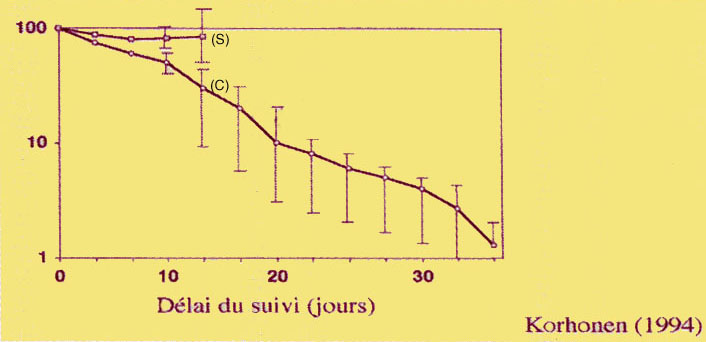 pour la décroissance de l'hCG pour les patientes évoluant spontanément (S) et la patientes ayant subi (salpingectomie