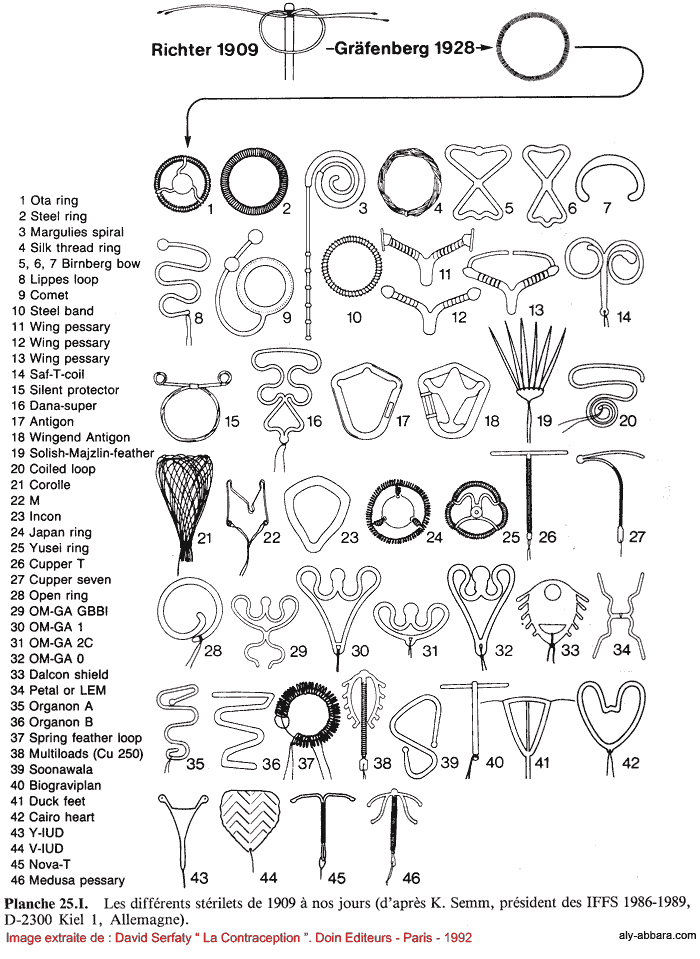 Différents modèles des dispositifs intra-utérins de 1909 à 1992 d'après K. Semm).