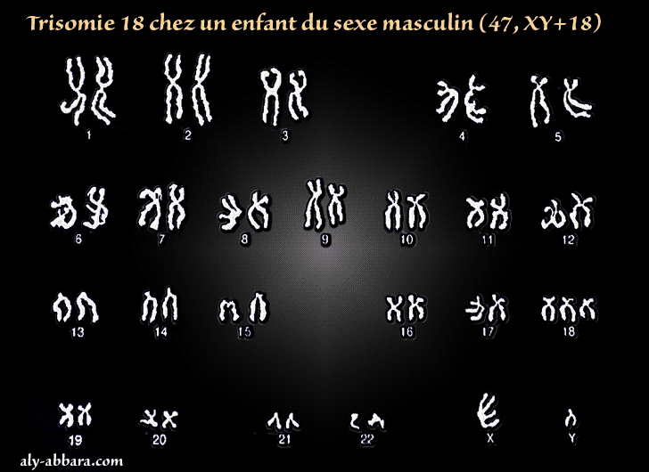 (ou syndrome E ou syndrome d'Edwards) : sur cette image on observe la présence de trois chromosomes 18 au lieu de deux seulement quand il s'agit de