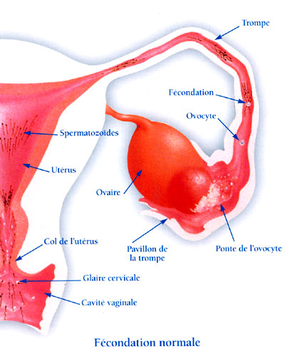 Les spermatozoïdes, après leur déposition dans le fond du vagin, ils traversent l'orifice externe du col utérin puis ils pénètrent dans le canal cervical, alors si les conditions physiques et chimiques de la glaire endocervicale sont favorables, les spermatozoïdes se déplacent vers l'orifice interne du col utérin, puis remontent dans la cavité utérine, ensuite ils pénètrent dans la lumière tubaire après avoir traversé les ostias tubaires internes qui se trouvent dans les angles latéraux du fond utérin.