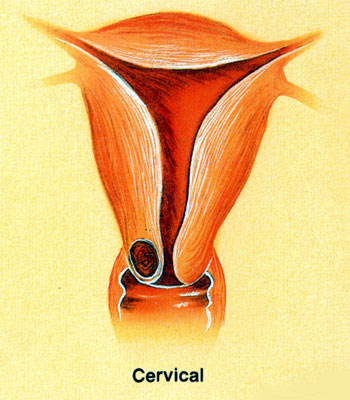 Illustration montrant les deux types de localisation cervicale des fibromes (myomes) utérins : un myome évoluant au sein de la paroi latérale droite du col utérin et un myome cervical sous-muqueux pédiculé et accouché par le col utérin.