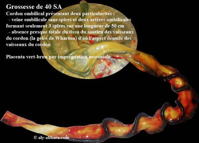 - absence presque totale du tissu de soutien gélatineux qui enveloppe les vaisseaux du cordon (la gelée de Wharton) d'où l'aspect dénudé des deux artères et la veine ombilicales.