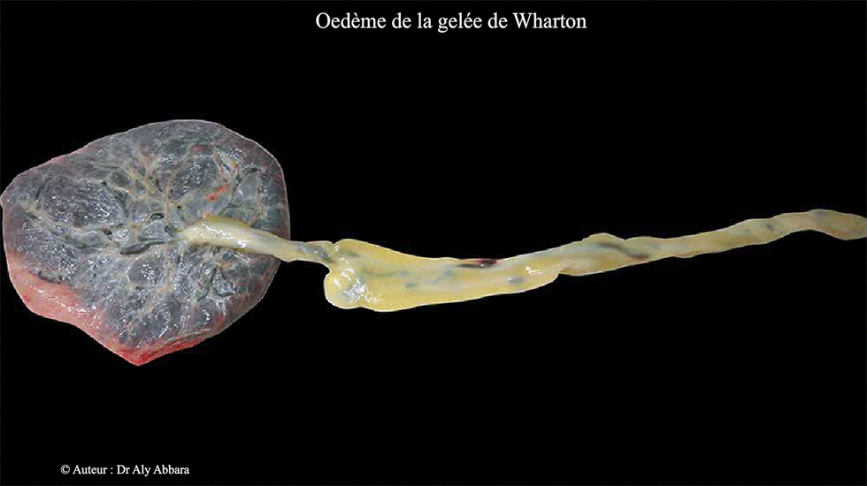 Images montrant des annexes fœtales caractérisées par la présence, sur un segment du cordon ombilical d'environ 10 cm de longueur, d'un œdème bien marqué de la gelée de Wharton avec, sur la coupe de section du cordon, on remarque aussi, la présence d'une infiltration inflammatoire périvasculaire, en anneau, autours des trois vaisseaux du cordon (infiltration leucocytaire à l'étude histologique) ; donc il s'agit d'une funiculite. |