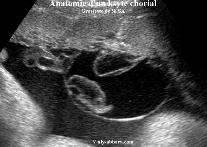 Série d'images montrant les éléments anatomiques qui forment un kyste chorial hémorragique évoluant sur la face fœtale du placenta, au niveau de l'insertion du cordon sur ce dernier. Il s'agit d'un kyste uniloculaire limité d'un côté par l'amnios, et de l'autre côté par la plaque choriale de la face fœtale du placenta ; il mesure 70 x 65 x 45 mm de diamètre ; à l'échographie, son contenu est hypoéchogène avec la présence de deux formations inertes, une détachée et flottante, et l'autre est encore attachée à la plaque choriale, il s'agit de deux vieux caillots organisés. Un vaisseau sanguin, entre le cordon ombilical et la face fœtale du placenta, parcourt la paroi amniotique fine du kyste ; une rupture accidentelle in utero de cet amnios, peut se compliquer par la rupture de ce vaisseau et par conséquence, d'une hémorragie fœtale fatale (hémorragie de Benckiser). L'étude macroscopique de ce kyste, confirme les données échographiques et montre aussi que son contenu est un liquide très sanglante quantifié à (45 cc), en rapport avec une hémorragie ancienne, intrakystique, puis la présence de caillots sanguins fraîchement constitués, au fond du kyste, sur la plaque choriale confirme la survenue d'une hémorragie active et récente. On note l'absence de signes échographiques et du Doppler fœtal en rapport avec une anémie fœtale, et enfin, pas d'anémie chez le nouveau-né, à la naissance. |