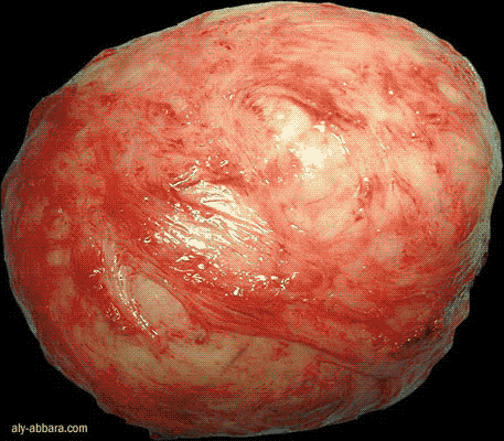 - L'examen anatomo-pathologique : masse de consistance élastique molle, de couleur rougeâtre, lilas. Histologiquement il s'agit d'un léiomyome de densité cellulaire faible comportant d'assez larges territoires de nécrose sans infiltrât inflammatoire. Dans les territoires les mieux conservés, les cellules fusiformes sont régulières, il n'y a pas de mitose. Des remaniements fibro-hyalins sont présents.