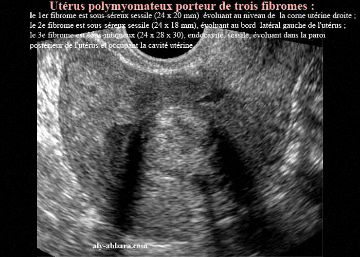 - le 3e fibrome (sur la coupe sagittale et les coupes transversales) est sous muqueux (24 x 28 x 30), endocavité, sessile, évoluant dans la paroi postérieur de l'utérus et occupant la cavité utérine.