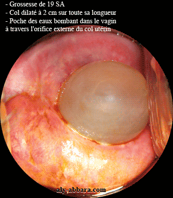 largement modifié à 19 semaines d'aménorrhée (dilaté à 2 cm sur la totalité de sa longueur) avec la poche des eaux accouchée à travers l'orifice externe du col utérin et bombante dans le fond du vagin .