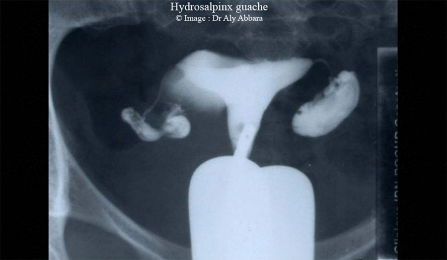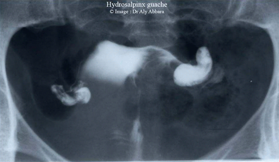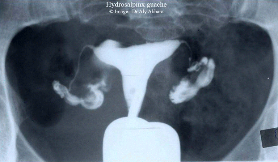 - L'obturation complète au pavillon qui caractérise l'hydrosalpinx se traduit radiologiquement sur le cliché de contrôle tardif par la rétention totale du produit de contraste au sein de la trompe avec absence de tout passage péritonéal.