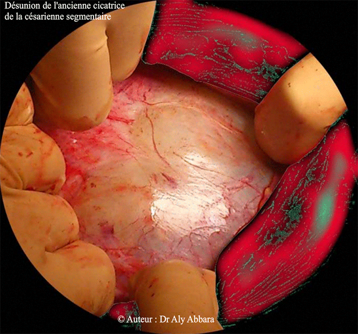 Images mettant en évidence une désunion totale d'une ancienne cicatrice de césarienne segmentaire transversale. On observe sur cette image l'écartement important des deux berges de l'ancienne hystérotomie de la césarienne, avec seulement la berge supérieure individualisable, car la berge inférieure est rétractée derrière la paroi postérieure de la vessie. Cette désunion totale de la cicatrice de l'hystérotomie permet d'apercevoir les membranes amniotiques recouvertes par le péritoine viscéral ; puis par transparence on identifie le liquide amniotique, les flocons du vernis et la présentation céphalique fœtale (vision directe per-opératoire). Il s'agit d'une désunion cicatricielle survenant chez une patiente ayant dans ses antécédents deux césariennes segmentaires transversale. Chez la patiente, cette pathologie qui pouvait être à l'origine de grave complications (rupture utérine et perte fœtale) était restée complètement asymptomatique, sa découverte fut fortuite lors d'une césarienne itérative, programmée, en dehors du travail, à 39 SA, pour utérus bicicatriciel. |