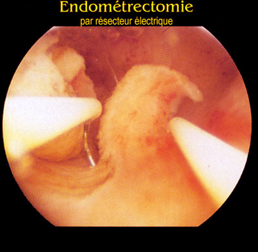 Image clinique montrant une endométrectomie (résection de l’endomètre) par hystéroscopie opératoire. Cette section est réalisée à l'aide d'une anse électrique bipolaire après l'extension de la cavité utérine par le moyen d'une injection dans la cavité utérine d'une solution de Glycocol.