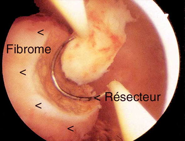 Image clinique montrant une myomectomie (résection d'un myome endocavitaire utérin) par hystéroscopie opératoire. Cette section est réalisée à l'aide d'une anse électrique bipolaire après l'extension de la cavité utérine par le moyen d'une injection dans la cavité utérine d'une solution de Glycocol.