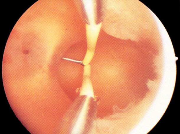 Image clinique montrant la section d'une d'une synéchie utérine (adhérances endocavitaires utérine) paramédiane droite, antéro-postérieure avec. Cette section est réalisée à l'aide d'une anse électrique bipolaire après l'extension de la cavité utérine par le moyen d'une injection dans la cavité utérine d'une solution de Glycocol.