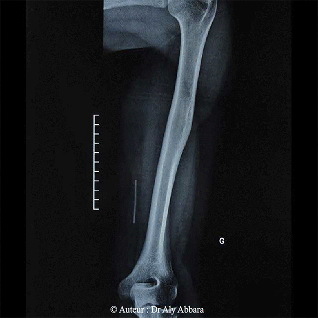Images montrant un implant contraceptif progestatif migrant profondément dans le tissu sous cutané de la face interne du bras gauche ; il est identifiable sur cette image du fait de sa radio-opacité ; il parait d'être en contact avec la surface extérieure du plan musculaire.